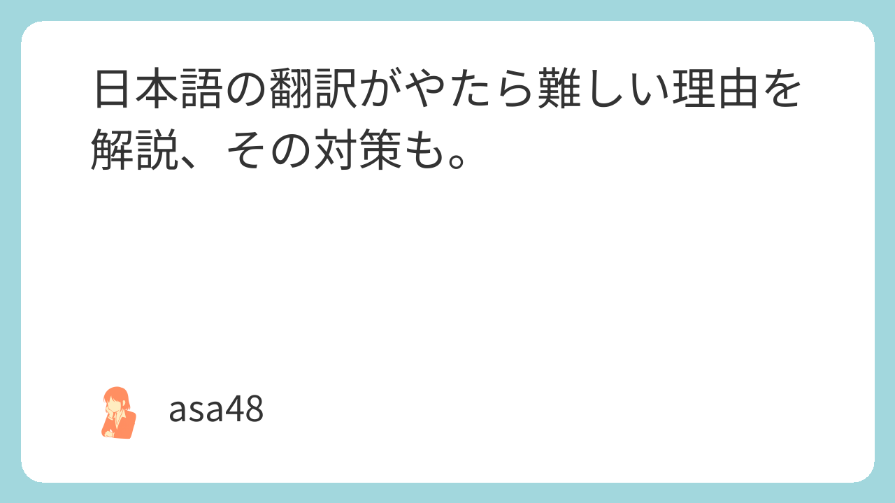 日本語の翻訳が難しいのは、言語としてダメだからじゃなくて、「相手に合わせる機能」が強すぎるからなの。誰にでも合わせられる子ってモテるけど、扱う側は細かい気遣いがいるでしょ。日本語もそれ。